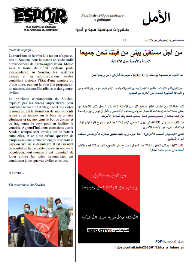 Das zweimonatlich erscheinende Magazin „Espoir – Al Amal“ wird von der Anarchistischen Gruppe im Sudan gemeinsam mit der CNT-IAA Frankreich und Freund*innen in Tunesien herausgegeben. Hier die deutsche Übersetzung von eines Textes der 2. Ausgabe (März-April 2025):