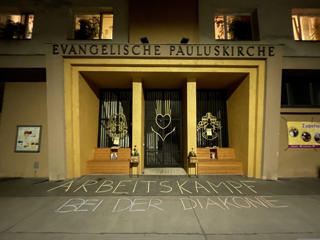 Daher wenden wir uns [am 03.04.] an die Bischöfin der Evangelischen Kirche, werden nahe dem Karfreitagsgottesdienst in der Pauluskirche im 3. Bezirk die Öffentlichkeit und die Bischöfin über die rechtwidrigen Vorgänge in der Diakonie informieren und auf die Einhaltung der minimalen bürgerlichen Arbeitsrechte pochen.